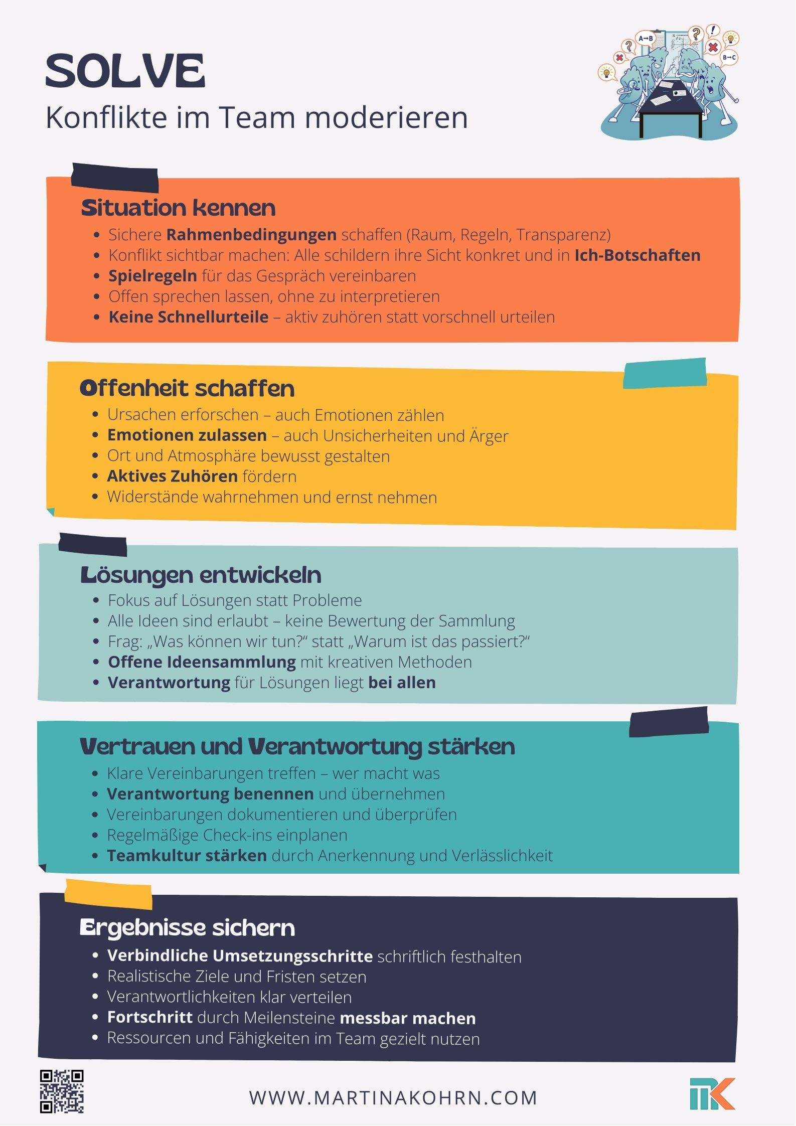 Im Workshop lernst du die 5 Schritte der SOLVE-Methode kennen – ein strukturierter Prozess, mit dem du jedes Team souverän durch Konflikte führst: